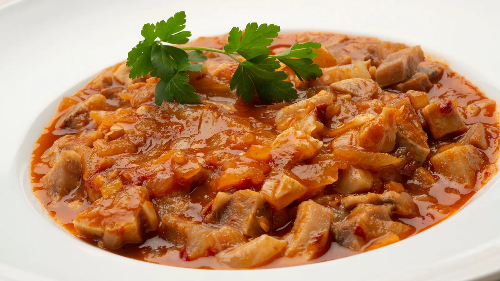 Incorpora la carne de los pimientos choriceros y mezcla. Añade el pimentón y el txakoli y dale un hervor. Incorpora también el tomate y los morros picaditos. Coloca la tapa y cocina todo junto durante 10-15 minutos a fuego suave. Sirve y decora con unas hojitas de perejil.