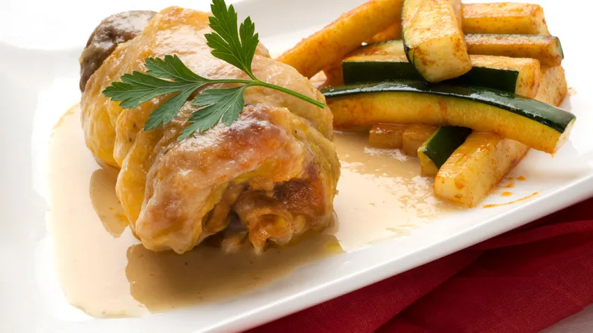 Muslos de pollo rellenos con calabacín salteado