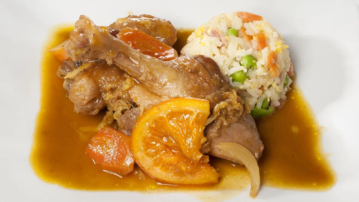 Bruno Oteiza prepara un guiso de pato a la naranja acompañado de arroz jazmín con zanahoria, guisantes y jamón cocido.