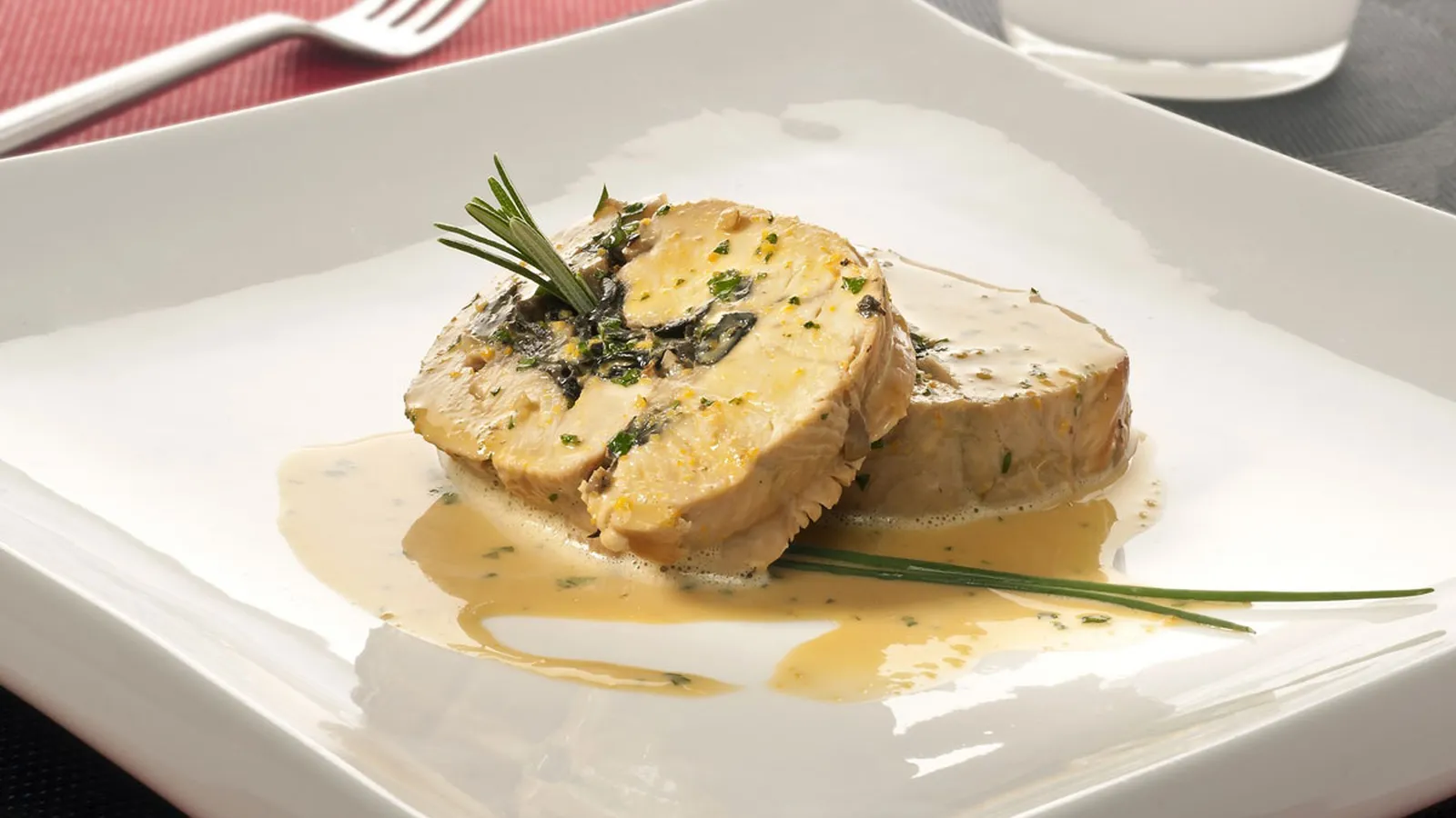 Sirve el pavo relleno de setas en un plato y salsea con la salsa de naranja. Decora con unos bastones de cebollino y una ramita de romero.