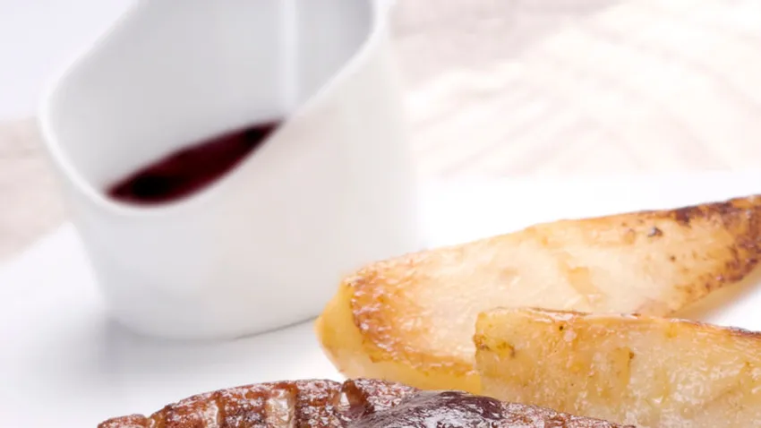 Receta de pechuga de pato al horno con salsa de vino de oporto y peras.