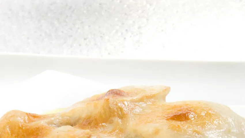 Sabrosa receta de pechuga de pollo al queso, un plato de filetes de pollo fritos con queso, acompañado de setas salteadas, puré de zanahorias y salsa de espinacas, de Ramón Roteta.