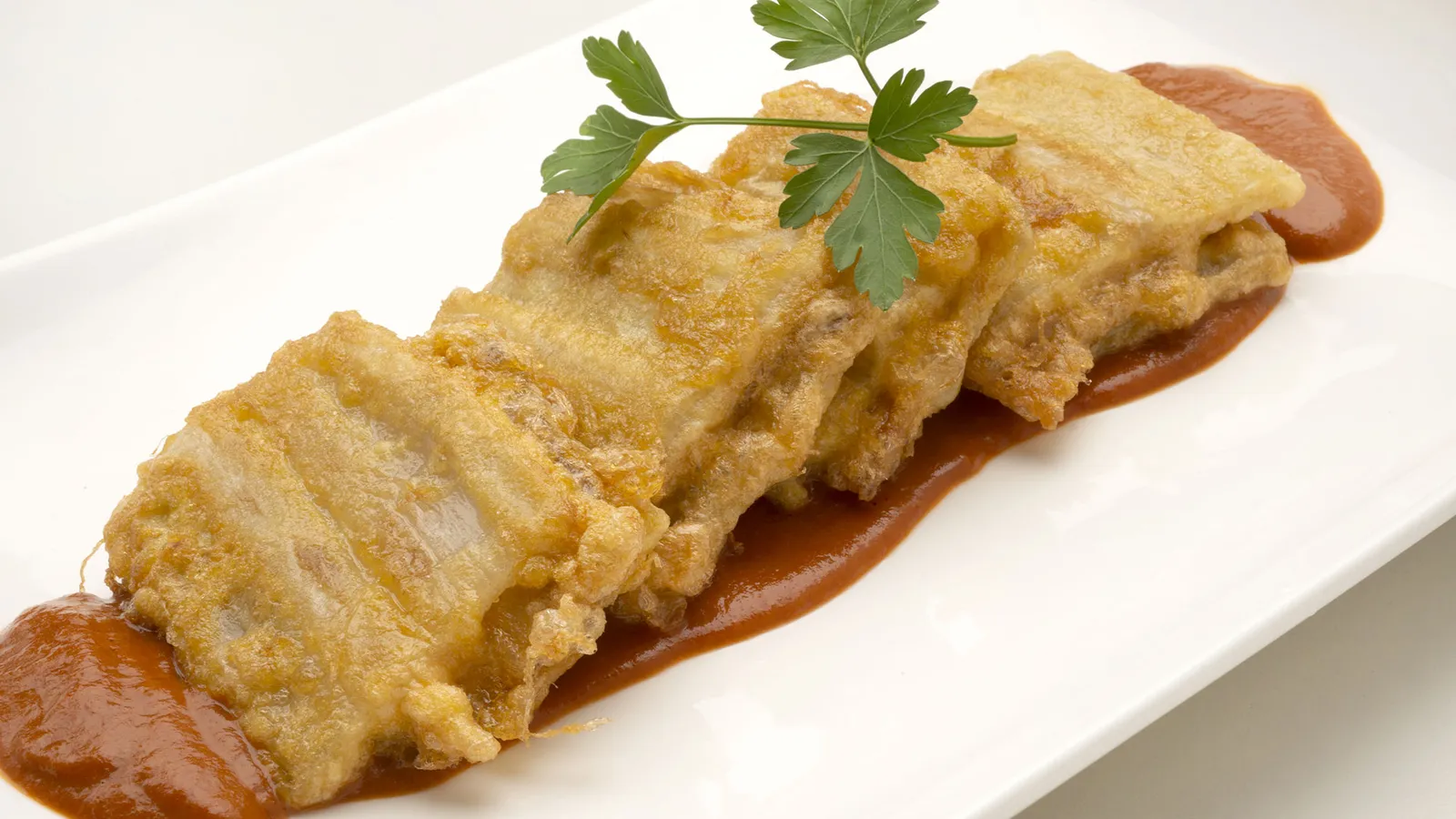 Sirve las pencas rellenas y acompáñalas con un poco de salsa vizcaína. Decora con unas hojas de perejil.