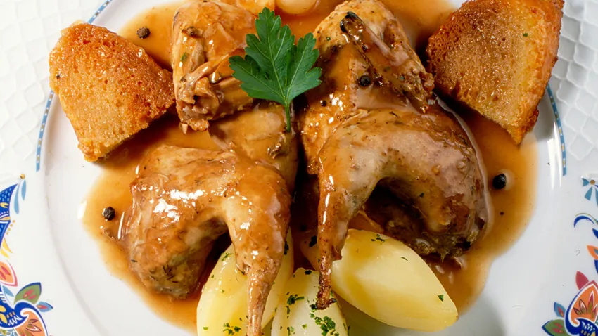 Receta de Karlos Arguiñano de perdices con chocolate sobre panes fritos.