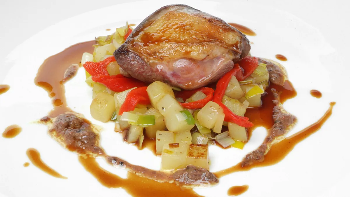 Receta de pichón asado, un plato de pinchón al horno con salsa de verduras y patatas y acompañado de un majado de hígado. Receta de Enrique Fleischmann.