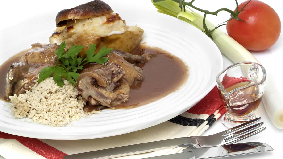 Receta de pichones en salsa, Eva Arguiñano propone pichones preparados con salsa de chocolate y acompañados de manzanas asadas y puré de castañas