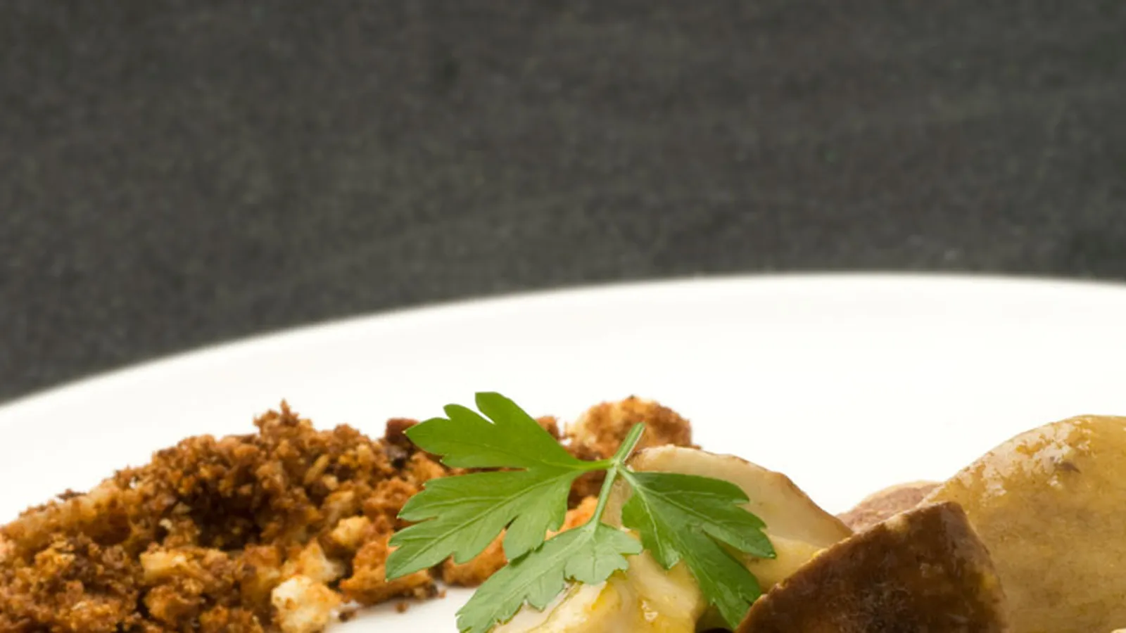 Sirve el guiso de cordero en el plato, salsea y acompaña con las migas. Decora el plato con una hojita de perejil.
