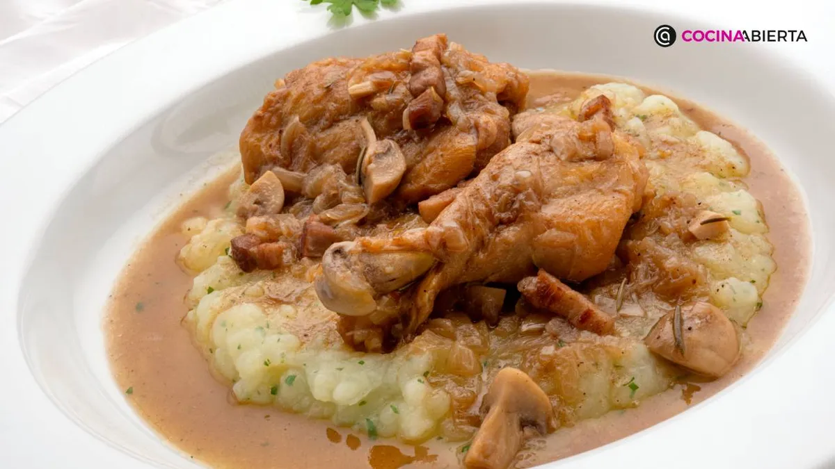 La elaboración es sencilla y 'muy curiosa'. Primero, pasa los muslos de pollo por una mezcla de harina y nuez moscada, luego dóralos y resérvalos. A continuación, prepara un sofrito con panceta, cebolla, champiñones y ajo. Una vez que la cebolla esté bien rehogada, añade vino de Oporto, licor de naranja y caldo.