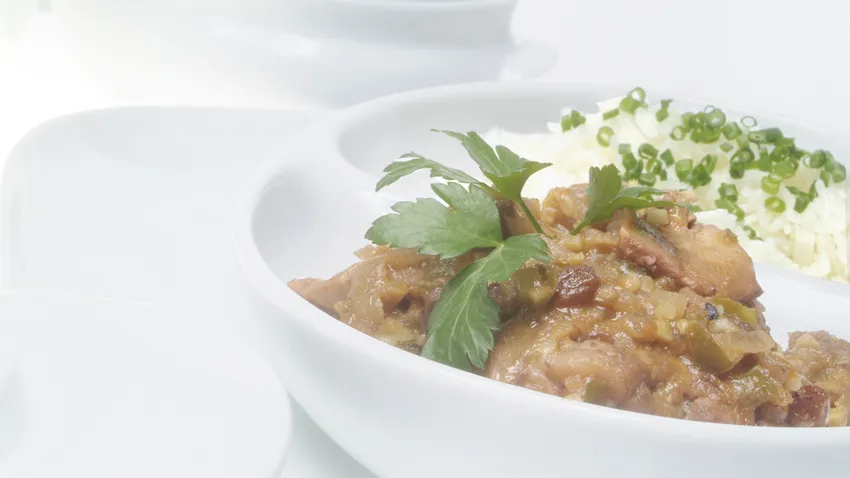 Receta de Eva Arguiñano de pollo a la griega. Pollo guisado en olla rápida con curry, yogur y almendras picadas.