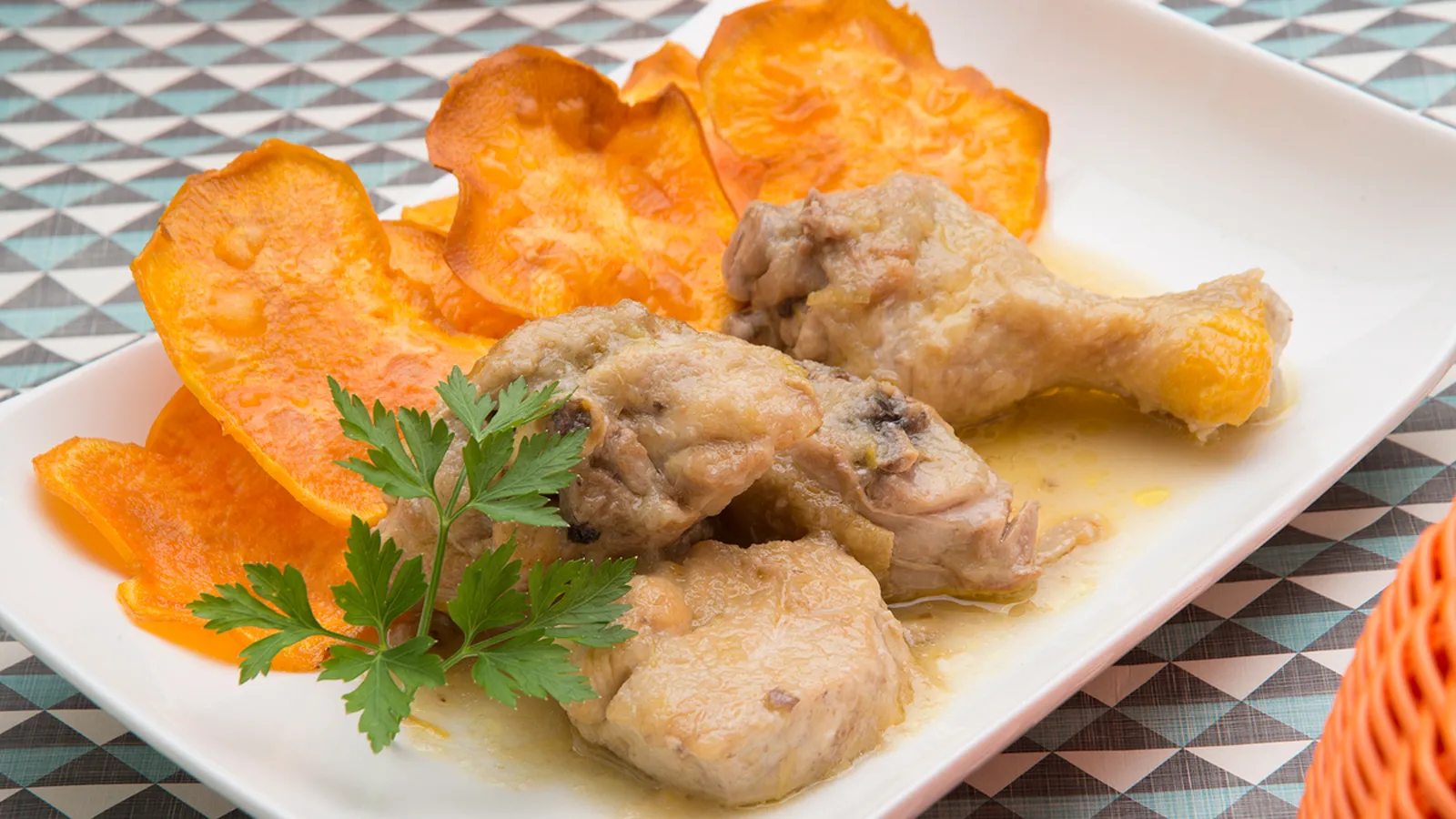 Sirve el pollo guisado y acompáñalo con los chips de boniato. Adorna con unas hojas de perejil.