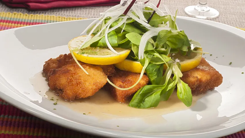 Corta las pechugas de pollo en tiras gruesas y salpimienta. Rebózalas en harina, huevo batido y pan rallado y fríelas en una sartén con abundante aceite caliente, hasta que queden bien crujientes. Escurre sobre papel absorbente de cocina.