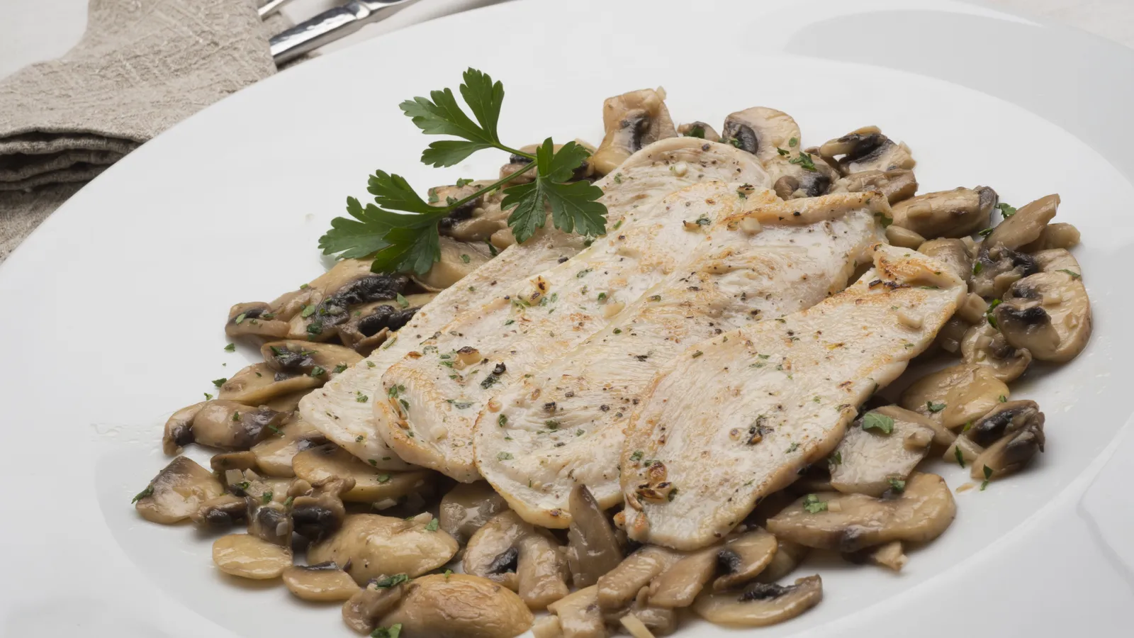 Receta de filetes de pollo macerados en perejil y ajo, cocinados a la plancha y acompañados de unos champiñones también salteados con ajo y aceite de oliva virgen.