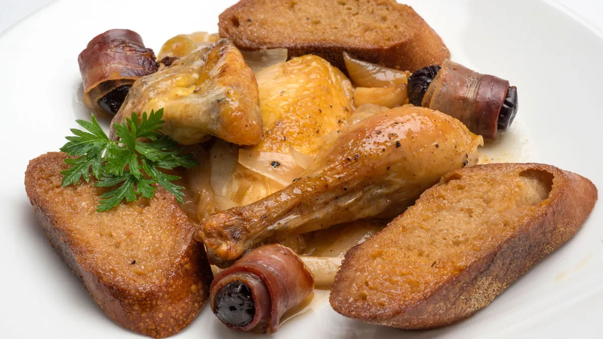 Karlos Arguiñano prepara pollo al txakoli asado en el horno con cebolleta acompañado de ciruelas envueltas en panceta y pan tostado al ajo.