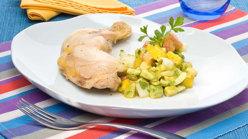 Receta de pollo al vapor con pico de gallo, una receta inspirada de la cocina mexicana, con pollo y una ensalada de mango, aguacates, tomates y cebolla (=pico de gallo) de Bruno Oteiza.