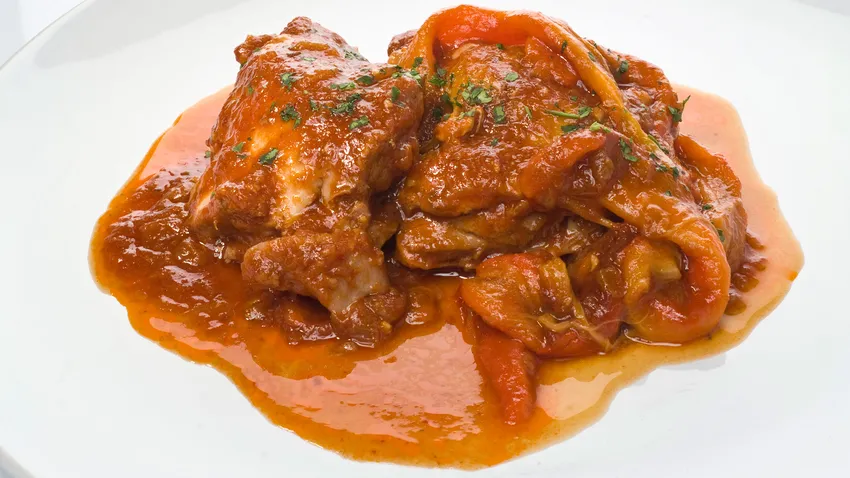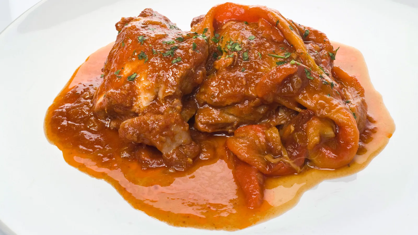 Receta de pollo a la vasca con crestas de gallo, un plato típico de la cocina vasca de pollo con salsa de pimientos morrones asados, y crestas de gallo, de Bruno Oteiza.