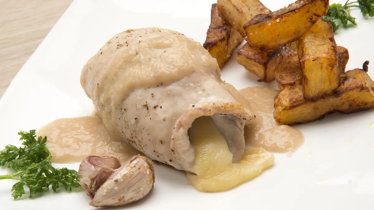 Karlos Arguiñano prepara filetes de pavo al horno rellenos de queso y ciruelas con salsa de chalotas y txakoli y acompañado de patatas fritas con ajo.