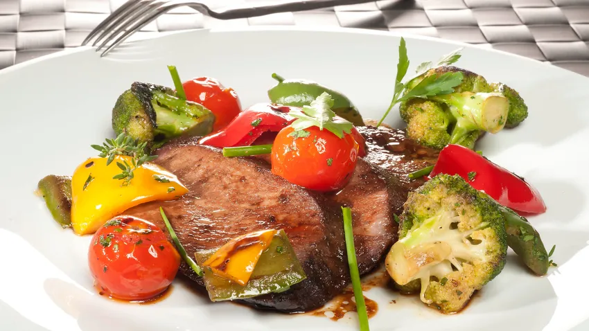 Receta de Bruno Oteiza de presa de cerdo ibérica macerada en Pedro Ximénez, salsa de soja y miel y asada en el horno. Para acompañar, un salteado de brócoli, pimientos de colores y tomates cherry.