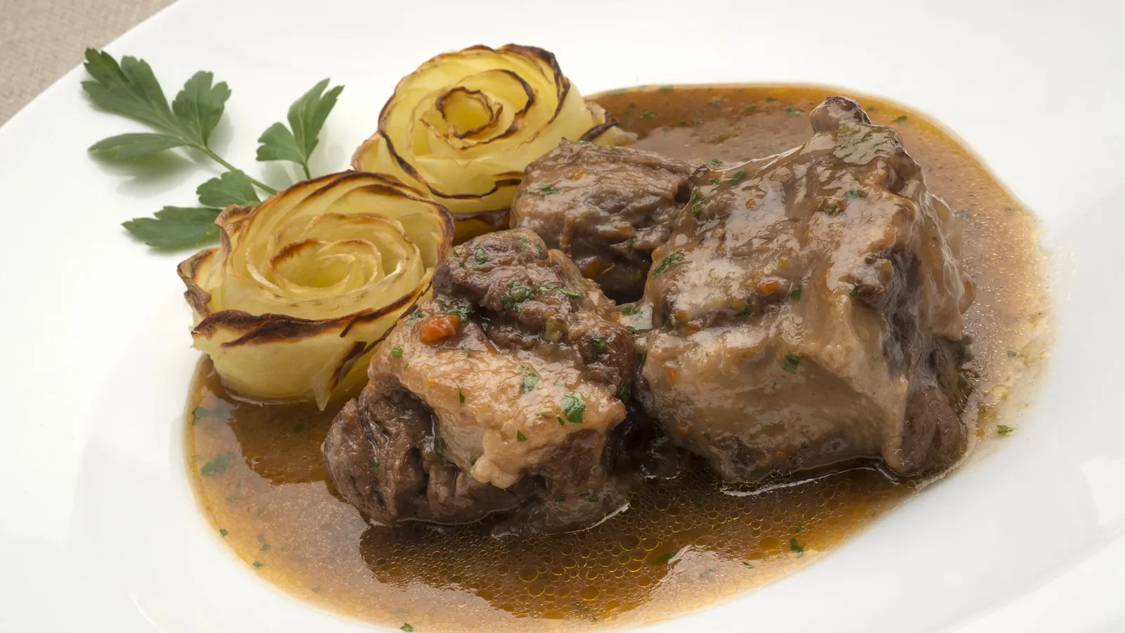 Reparte el rabo en 4 platos y coloca un par de rosas de patata en cada uno. Decora con una hojita de perejil.