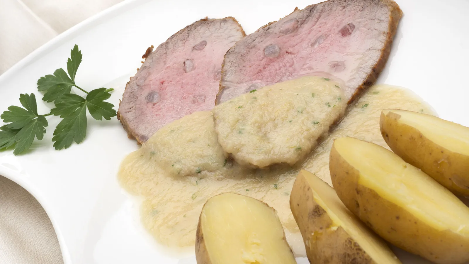 Corta el redondo en lonchas y sírvelo. Acompáñalo con la salsa y las patatas abiertas por la mitad. Adorna con unas hojas de perejil.