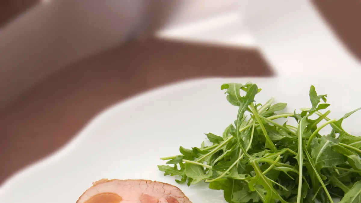 Corta la carne en rodajas no muy gruesas y dispón en una fuente, napa con la salsa y acompaña con la rúcula aliñada con sal, aceite y vinagre.