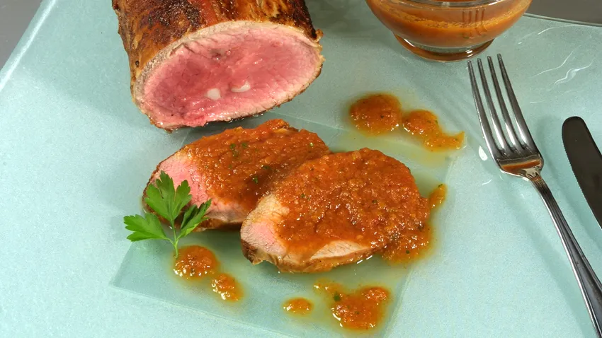 Pasa la salsa por el pasa purés y espolvoréala con un poco de perejil picado. Corta el redondo en filetes, sírvelos en una fuente caliente y salsea.