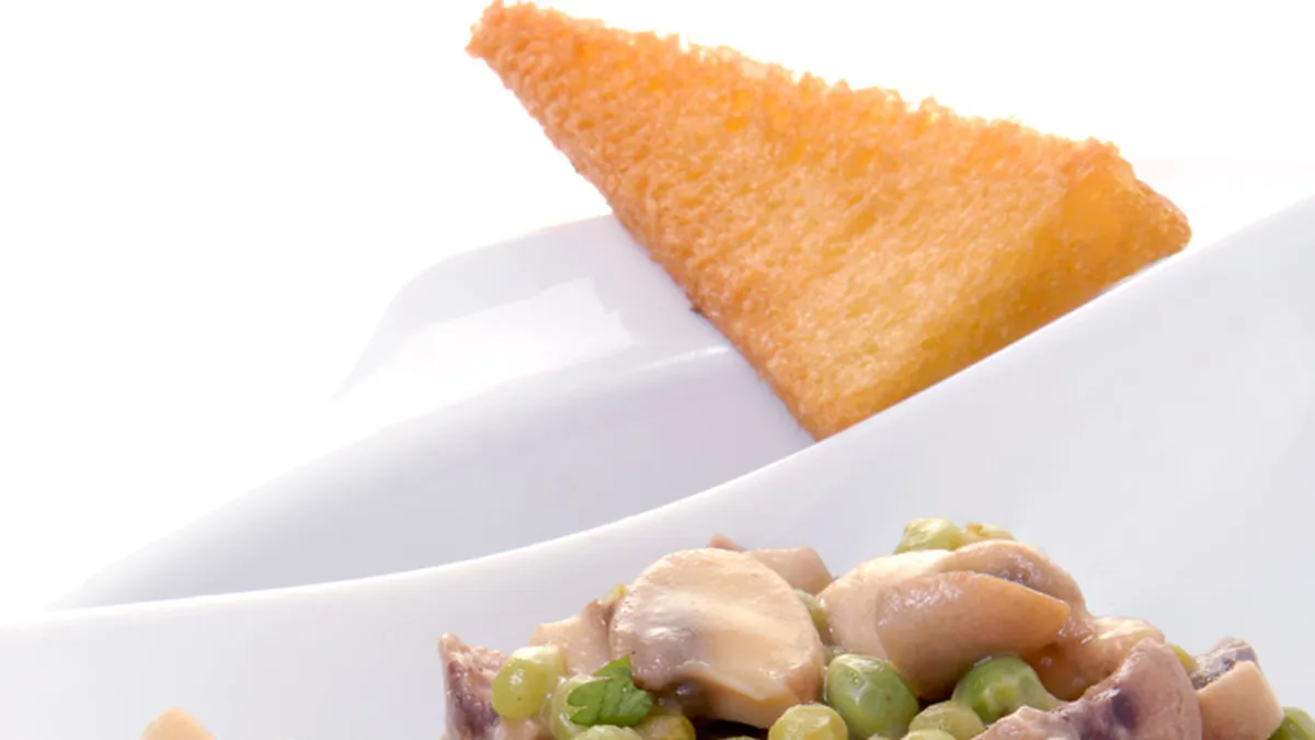 Receta de riñones de cordero cocinados con guisantes y champiñones y acompañados de una salsa de vino de Jerez.