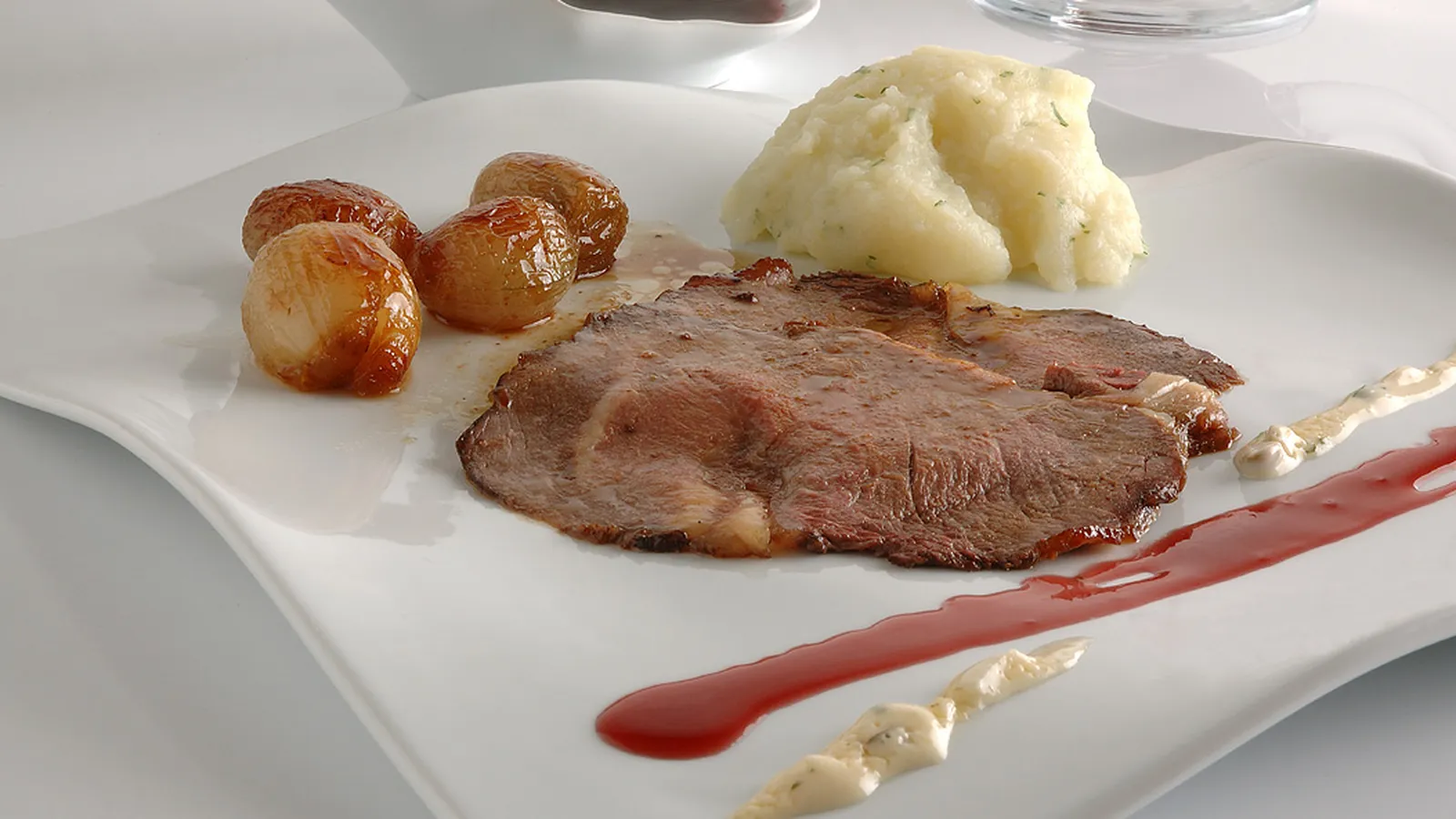 Receta de roast beef de lomo de ternera con chalotas, puré de patatas y salsa de vino tinto y salsa tártara.
