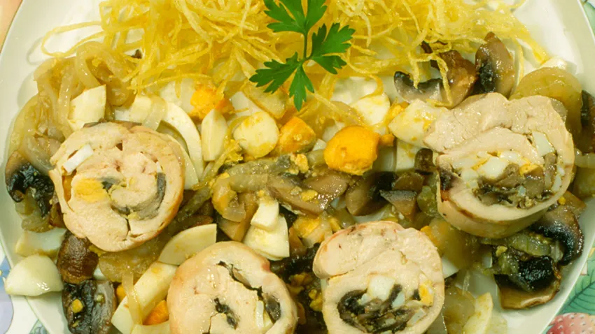 Receta de Karlos Arguiñano de rollitos de pollo con champiñones y huevo cocido.