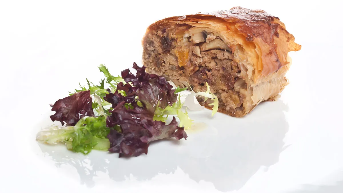 Rollo de carne y champiñones con frutos secos