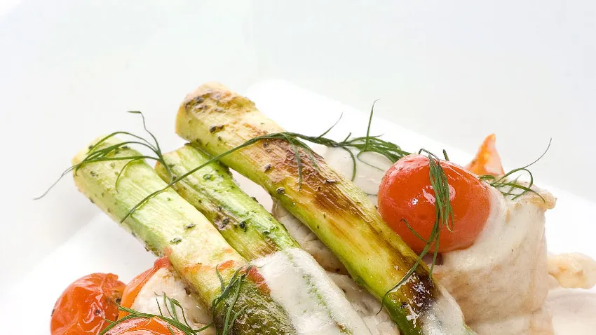 Trocea el rollo y sírvelo con las verduras salteadas. Salsea y decora con eneldo.