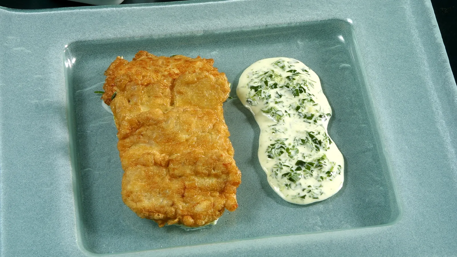 Receta de filetes de sesos de ternera rebozados acompañados de una salsa ligera de espinacas.