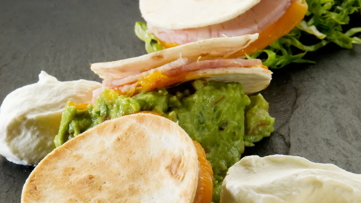 Receta de tortitas de trigo rellenas de jamón y queso. Para acompañar las sincronizadas guacamole y una ensalada de rabanitos.