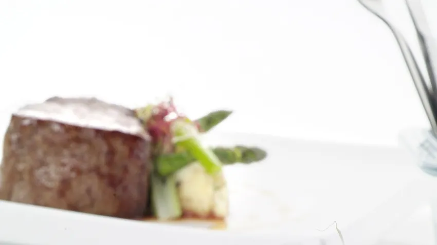 Prepara el plato poniendo en el centro el puré de patata, encima los espárragos, la cebolleta y los germinados. Coloca el solomillo glaseado y acompaña con un chorrito de miel de cerveza.