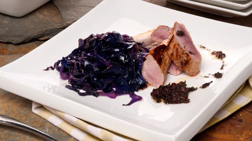 Echa un chorrito de aceite a la misma paellera donde has dorado el solomillo, corta la lombarda en juliana fina y añádela. Sazónala y saltéala a fuego fuerte durante un par de minutos. Tápala, baja el fuego y cocínala durante 12-14 minutos más.