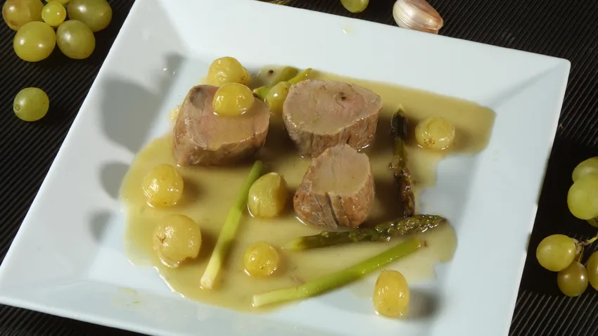 Receta de solomillo de cerdo con uvas, verduras crujientes y una salsa de vino de jerez.
