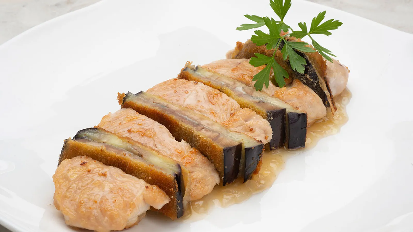 Sirve en cada plato un solomillo de pavo y un montadito de berenjena. Adorna los platos con unas hojas de perejil.