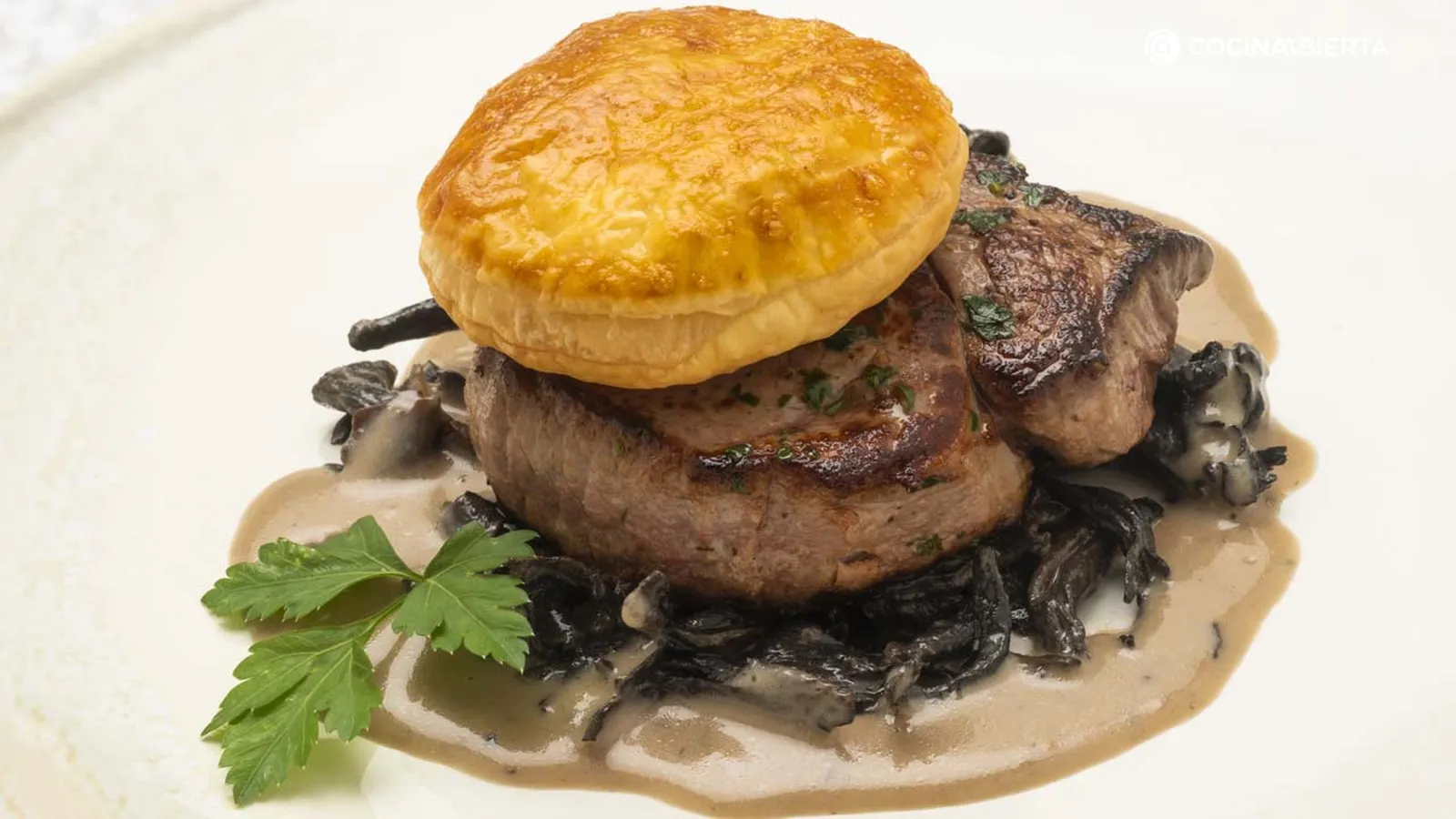 Sirve la salsa de trompetas de la muerte en la base de los platos (si quieres que quede más espesa, agrega un poco de harina de maíz refinada diluida en agua fría y dale un breve hervor). Coloca encima los solomillos, salséalos con el vino amontillado y pon encima el círculo de hojaldre. Adorna los platos con unas hojas de perejil.