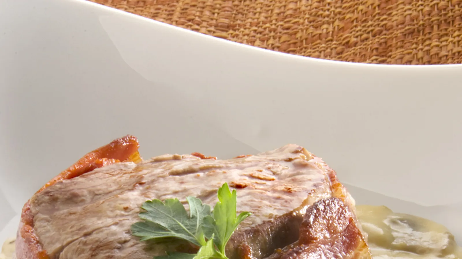 Receta de solomillo de ternera asado y envuelto en panceta acompañado de una salsa champiñones y vermut blanco.