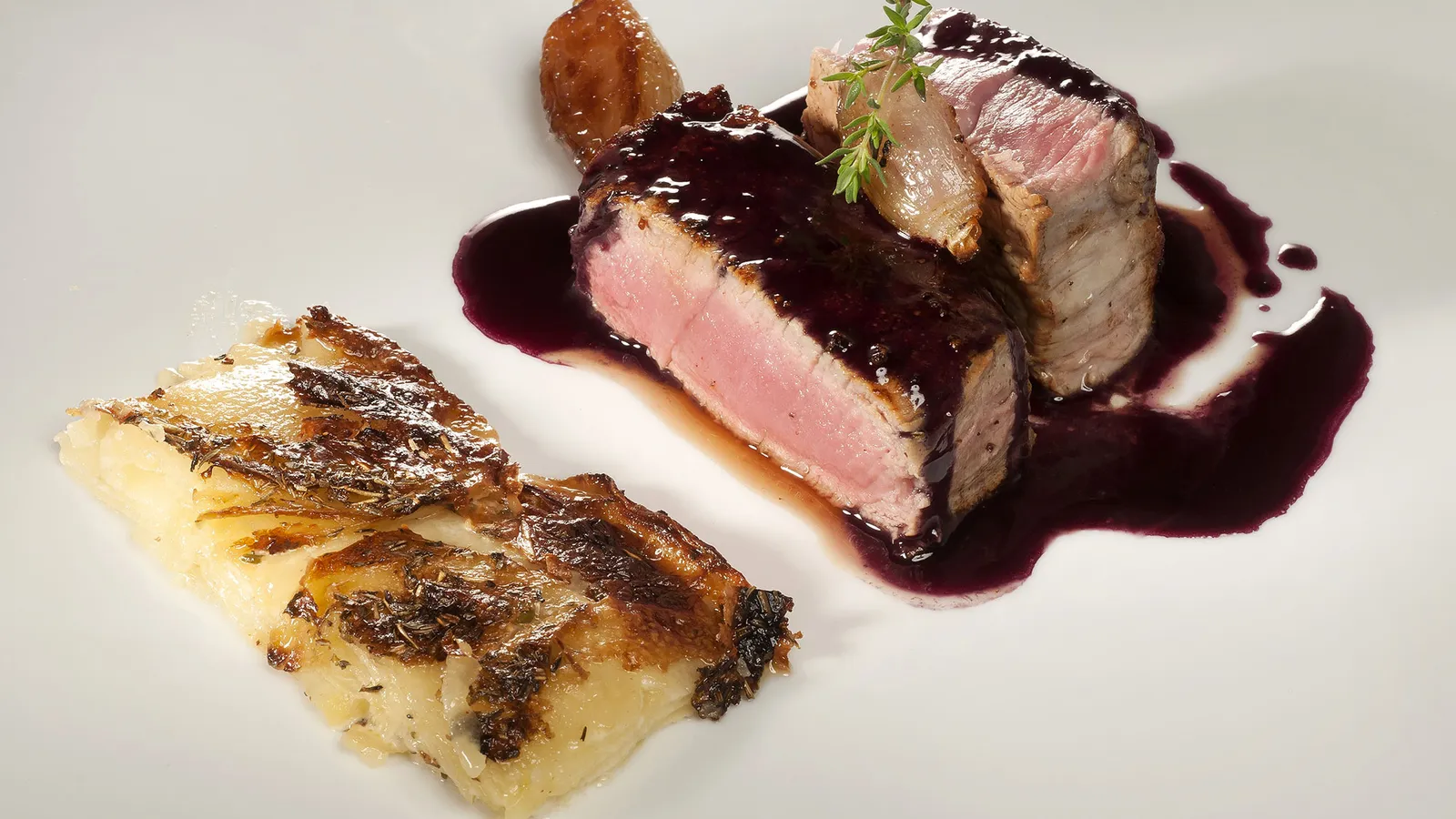 Solomillo al vino tinto con patatas gratinadas