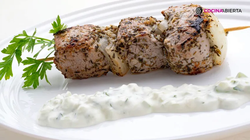 Elaboración de la receta souvlaki griego con salsa tzatziki