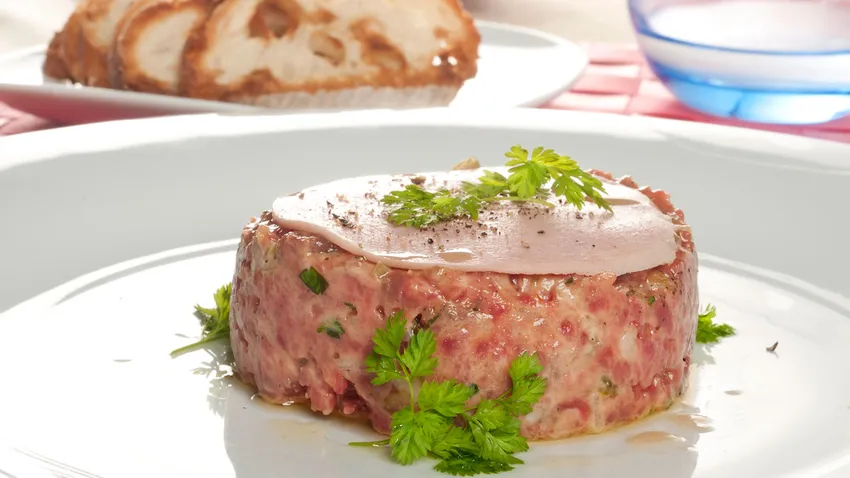Receta de Bruno Oteiza de steak tartare trufado, un plato de carne picada con chile chipotle, mostaza, pepinillos y cebolleta y aromatizada con aceite de trufa negra.
