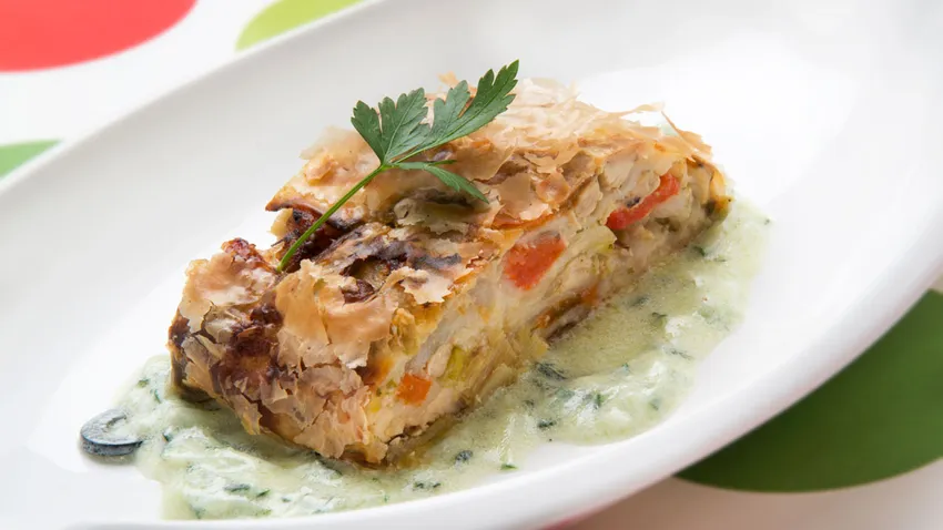 Receta de Karlos Arguiñano de strudel de pollo, un plato elaborado con pasta filo rellena de pollo y verduras y acompañada de salsa de pepino.
