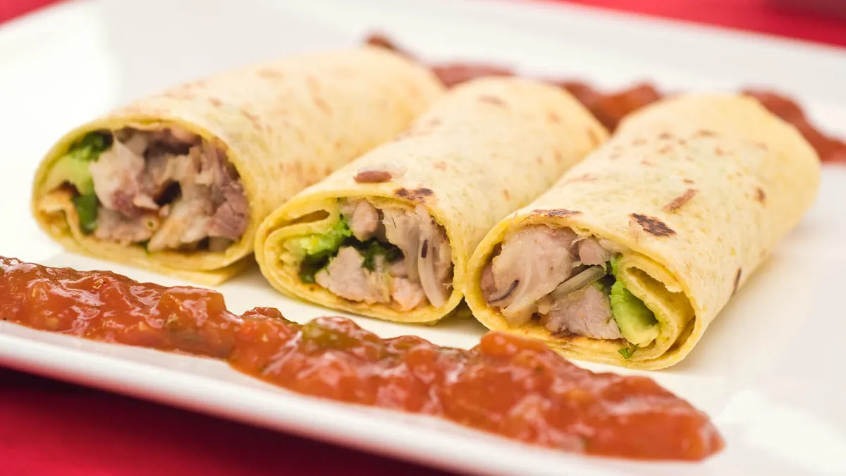 Pon dentro de cada tortilla un poco de carne, un poco de cebolleta, unas rodajitas de aguacate, cilantro picado al gusto y un chorrito de salsa. Enróllalos y sírvelos acompañados con el resto de la salsa mexicana.