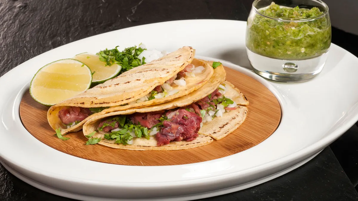 Monta los tacos con carne, cebolleta picada, cilantro picado, un chorro de limón y salsa verde cruda al gusto. Cierra el taco y listo para comer.