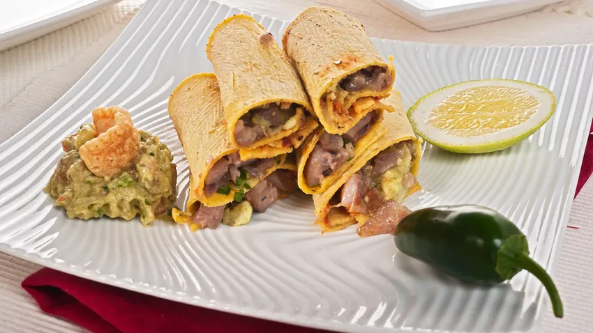 Receta de Bruno Oteiza de tacos de trompa acompañados de salsa roja y guacamole, un plato inspirado en la cocina mexicana.