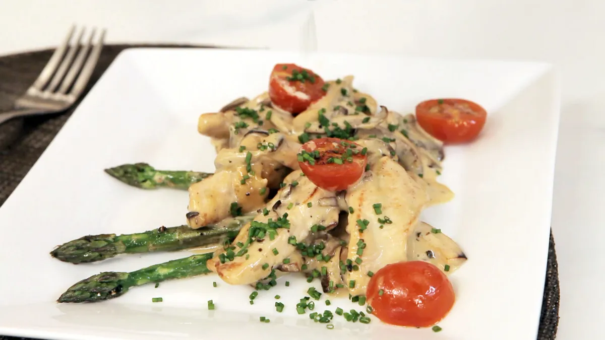 Coloca el pavo, las setas, los tomates y los espárragos en un plato con la salsa y adorna con cebollino picado.