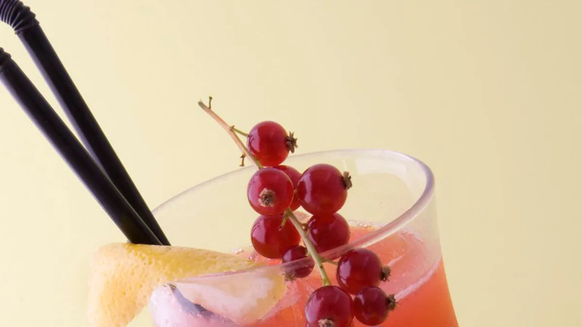 A continuación con nuestro exprimidor, echamos el jugo de limón a la coctelera y agitamos bien. Echamos hielo en la copa y servimos. Hasta aquí tenemos lo que es un daikiri normal de fresa. Para darle el toque final de las burbujas añadimos el refresco de limón. Para termirar un twist de limón para perfumar y unas grosellas para decorar.