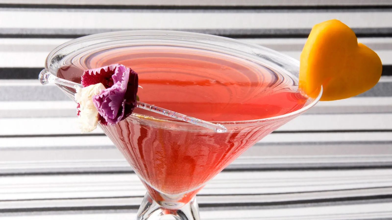 Para decorar, recorta una rodaja de calabaza con forma de corazón con un molde de dicha forma. Hazle un corte y colócala en el borde de la copa. Ensarta en una brocheta flores comestibles y apóyalas en el borde de la copa.