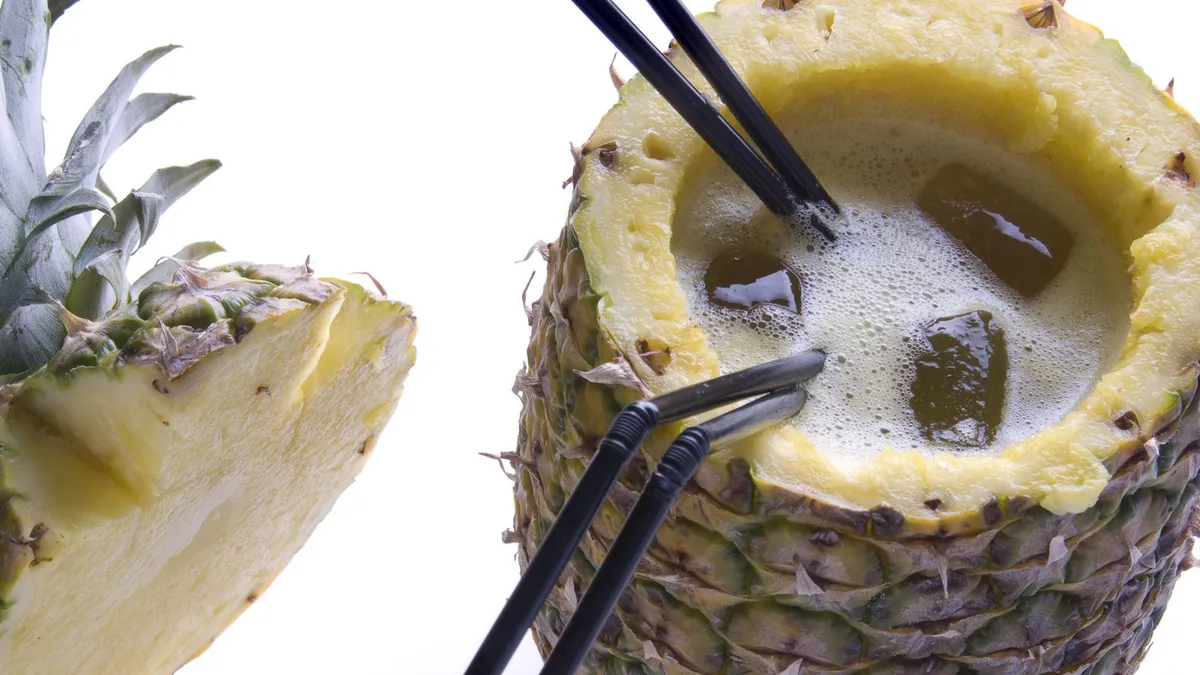Para la propuesta sin alcohol vamos a hacer un original cóctel que serviremos en la misma piña. Para ello tenemos que vaciar la piña. Utilizaremos esa pulpa de la piña, al que añadiremos un poco de agua para hacer un zumo natural. Ahora para el cóctel, añadimos hielo a la coctelera y añadimos el zumo natural de piña y sirope de piña. A continuación azucar líquido y lima. Agitamos bien y servimos en nuestra copa-piña. La tapamos y ponemos las pajitas. Ya tenemos nuestro cóctel de aspecto tropical