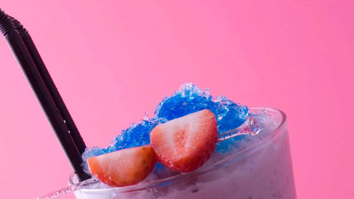 Para este cóctel necesitamos una copa de trago largo que vamos a decorar con curaçao azul. En esta ocasión vamos a utilizar una batidora. Echamos en la jarra de la batidora unas cucharadas de helado de fresa, un poquito de leche, nata líquida y fresa natural para potenciar el sabor. Lo batimos todo bien y servimos en la copa. Para decorar echamos hielo picado y lo coloreamos también con el curaçao azul en spray. Como toque final ponemos unas fresas y pajitas.